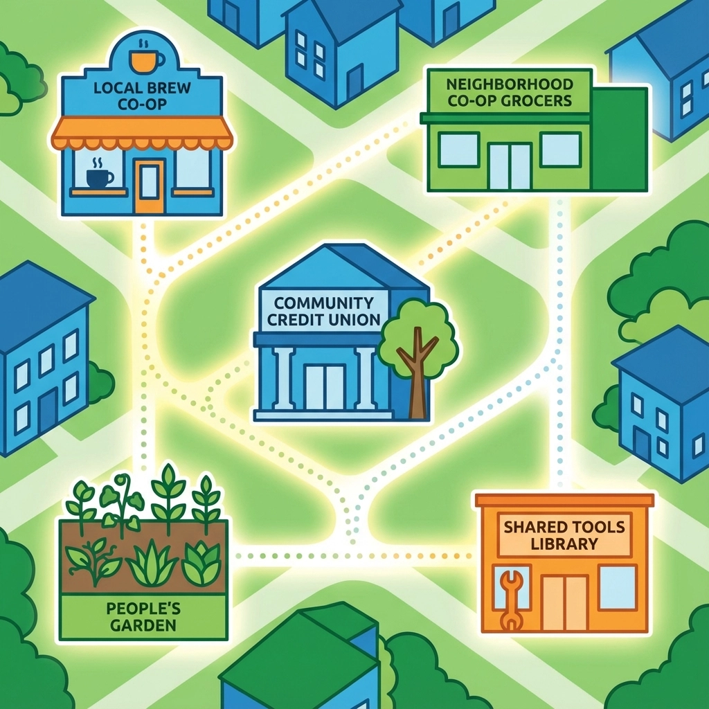 It shows up in community development financial institutions, basically credit unions and loan funds that actually understand the neighborhood and are willing to lend to local businesses that big banks won't touch. It shows up in shared ownership models for everything from community kitchens to tool libraries to childcare cooperatives.